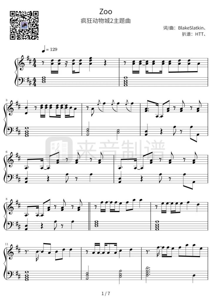疯狂动物城2主题曲 Zoo 钢琴谱分享