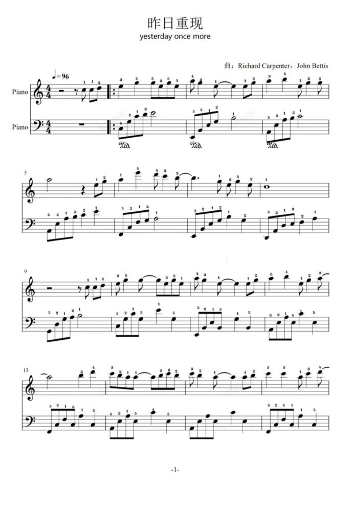 昨日重现 yesterday once more 钢琴五线谱