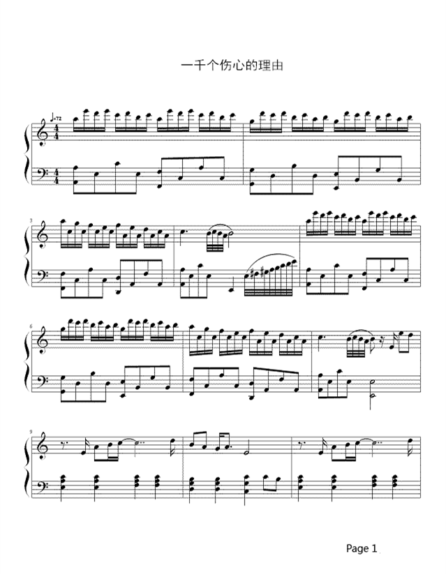 一千个伤心的理由 钢琴曲谱 – 张学友